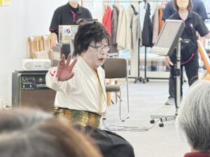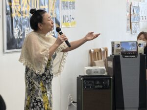 ↑カラオケを披露した丹藤さん。湯口デイには度々お越し頂いておりましたが、たまちの運動場は初出演です。