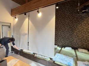 日中はお客様がお休みする静養スペース、午後は余興のステージとなっていたのですが、この度ロールカーテンを追加することとなりました。